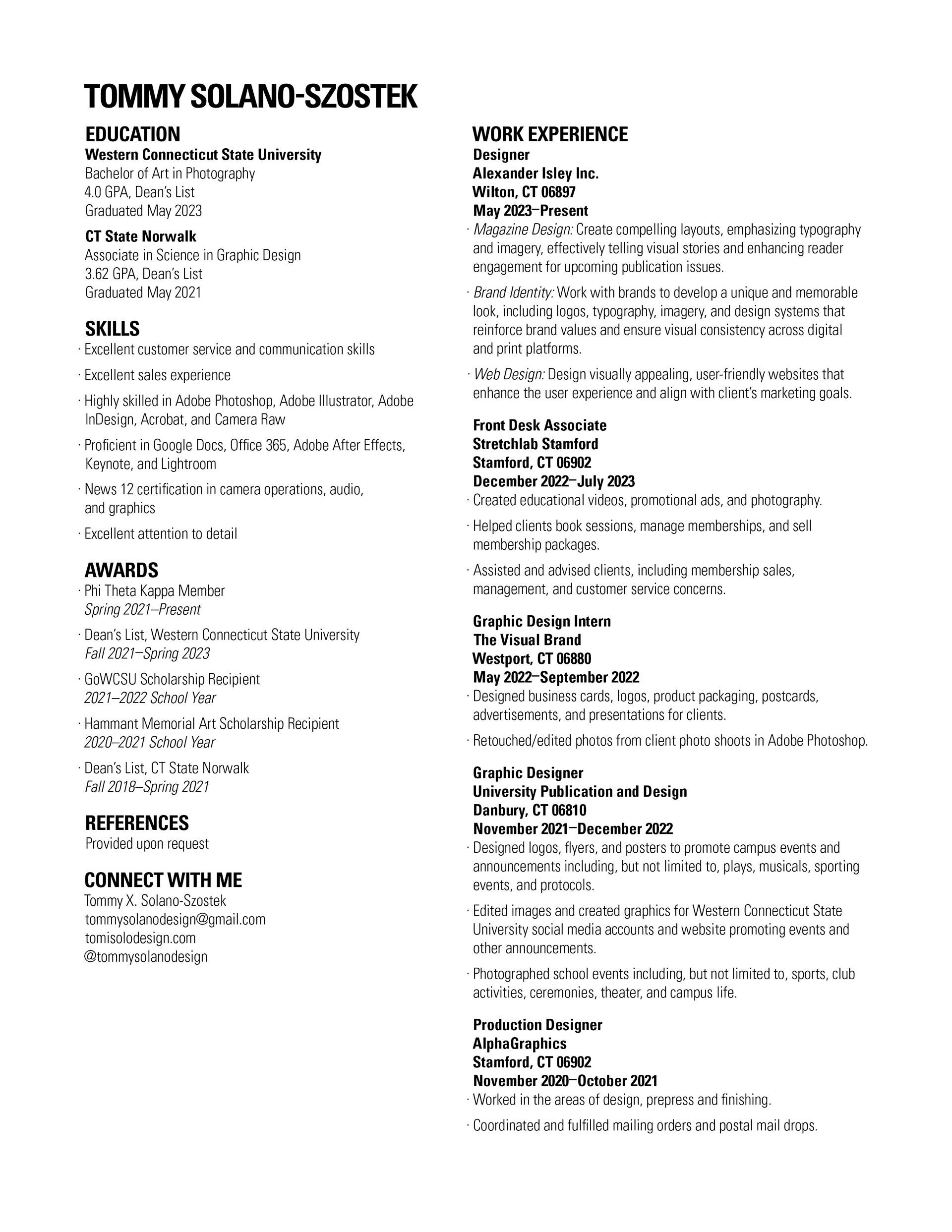 I’m a graphic designer and photographer based out of Southern Connecticut. I love creating print and digital media for clients, brand identities, creating social media campaigns/ roll outs, and documenting events. I graduated with an associates degree from CT State Norwalk in Graphic Design and a Bachelors degree from Western Connecticut State University in Photography.